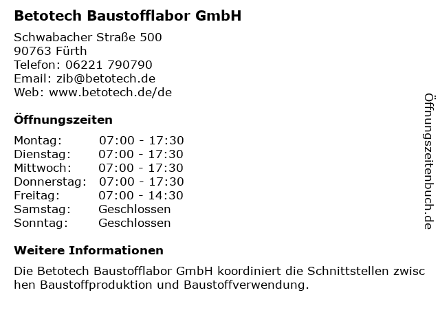 | Öffnungszeiten Betotech Baustofflabor GmbH in Fürth anzeigen | |