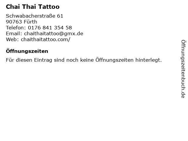 | Öffnungszeiten Chai Thai Tattoo in Fürth anzeigen | |