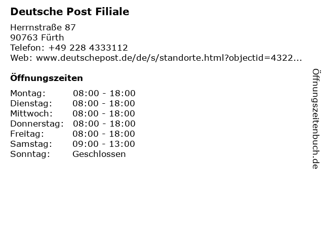 Deutsche Post Filiale in Fürth | Telefonnummer, Öffnungszeiten und Adresse
