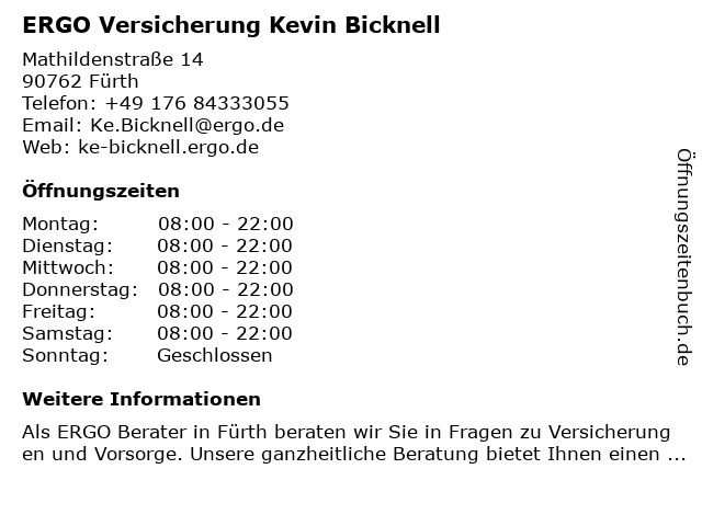 2 ERGO Versicherung Gerlinde Klaba Generalagentur Versicherungsfachfrau (Entfernung: 2,86 km) Wilhelmshavener Str. 44, 90766 Fürth 6 DAS/Ergo Generalagentur Christof Zametzky Versicherungsagentur (Entfernung: 9,82 km) Beethovenstr. 3, 90491 Nürnberg |