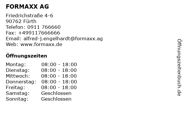 | Öffnungszeiten FORMAXX AG in Fürth anzeigen | |