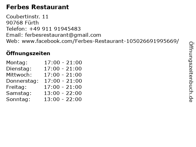| Öffnungszeiten Ferbes Restaurant in Fürth anzeigen | |