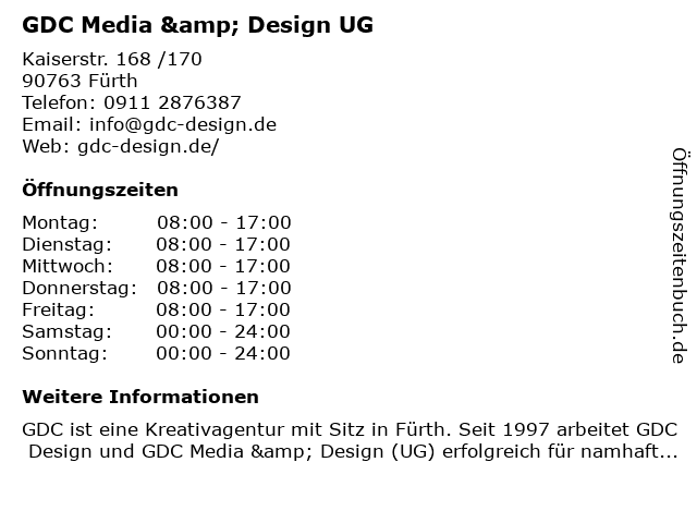 | Öffnungszeiten GDC Media & Design UG in Fürth anzeigen | |
