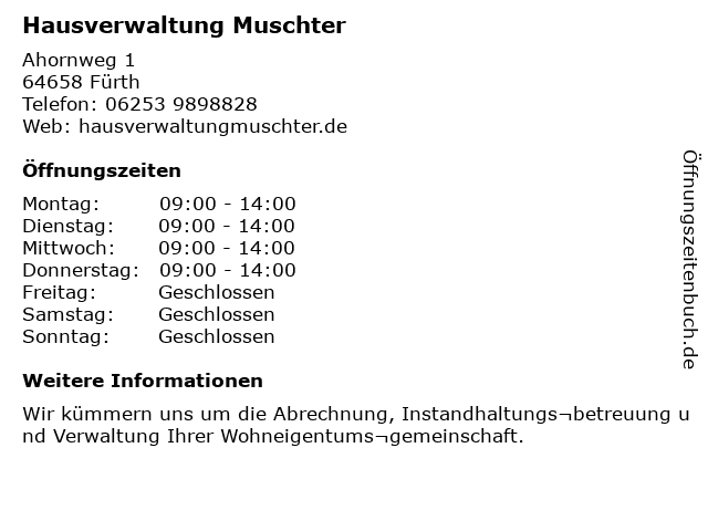 | Öffnungszeiten Hausverwaltung Muschter in Fürth anzeigen | |