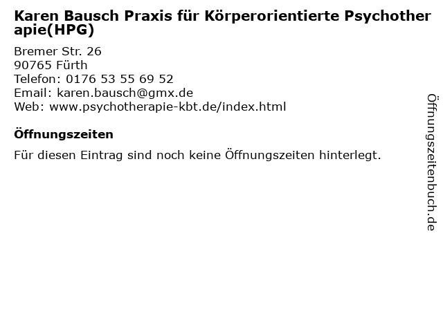 | Karen Bausch Praxis für Körperorientierte Psychotherapie(HPG) anrufen | |