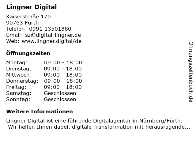 | Öffnungszeiten Lingner Digital in Fürth anzeigen | |