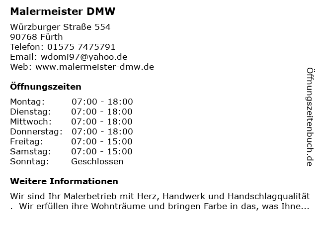 | Öffnungszeiten Malermeister DMW in Fürth anzeigen | |