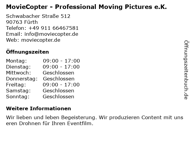 1 MovieCopter - Professional Aerial Pictures (Entfernung: 8,50 km) Worzeldorfer Straße 46, 90469 Nürnberg 6 Bassline Gesellschaft für Veranstaltungstechnik mbH (Entfernung: 5,51 km) Humboldtstr. 7, 90443 Nürnberg |