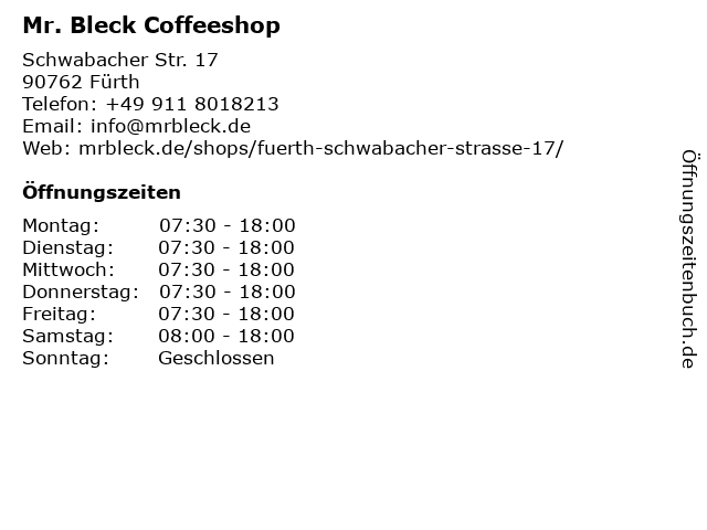 | Öffnungszeiten Mr. Bleck Coffeeshop in Fürth anzeigen | |