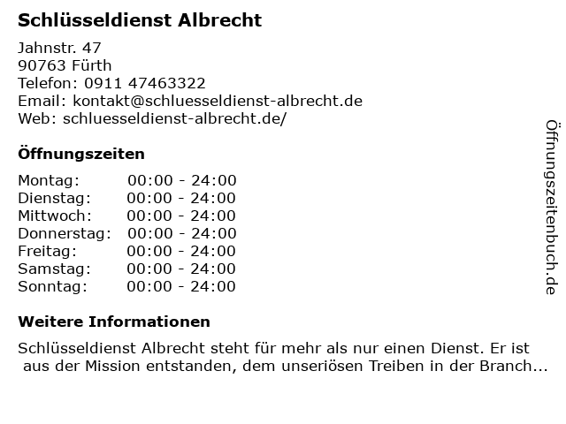 | Öffnungszeiten Schlüsseldienst Albrecht in Fürth anzeigen | |