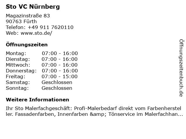 | Öffnungszeiten Sto VC Nürnberg in Fürth anzeigen | |
