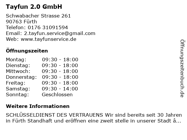 | Öffnungszeiten Tayfun 2.0 GmbH in Fürth anzeigen | |