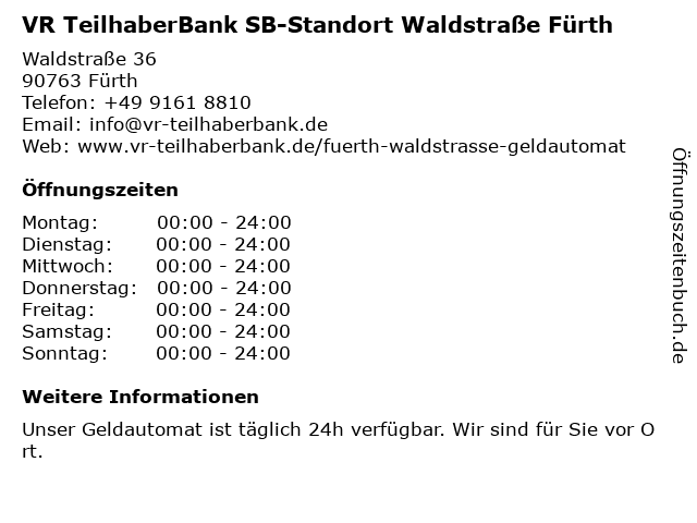 Branchen & Suchbegriffe zu VR TeilhaberBank SB-Standort Waldstraße Fürth:bank, bausparen, beratung, festgeld, geldautomat, genossenschaft, immobilien, kredit, sb, standort, tagesgeld, teilhaberbank, versicherung, vr, waldstraße |