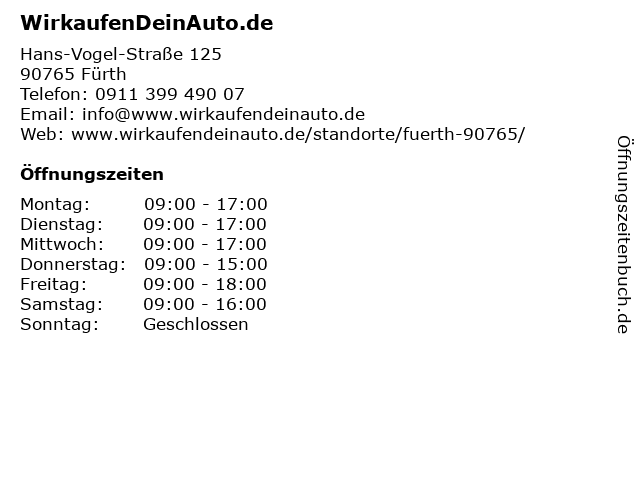 | Öffnungszeiten WirkaufenDeinAuto.de in Fürth anzeigen | |