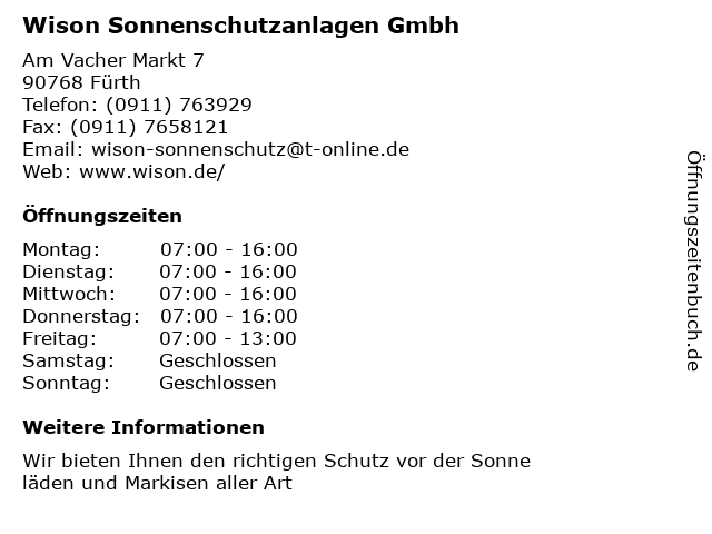 | Öffnungszeiten Wison Sonnenschutzanlagen Gmbh in Fürth anzeigen | |