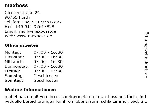 | Öffnungszeiten maxboss in Fürth anzeigen | |