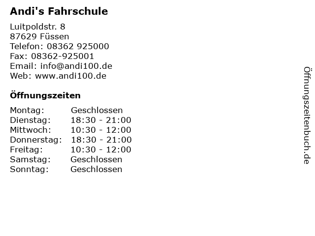 | Öffnungszeiten Andi's Fahrschule in Füssen anzeigen | |