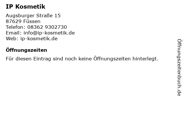 | Öffnungszeiten IP Kosmetik in Füssen anzeigen | |