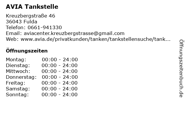 | Öffnungszeiten AVIA Tankstelle in Fulda anzeigen | |