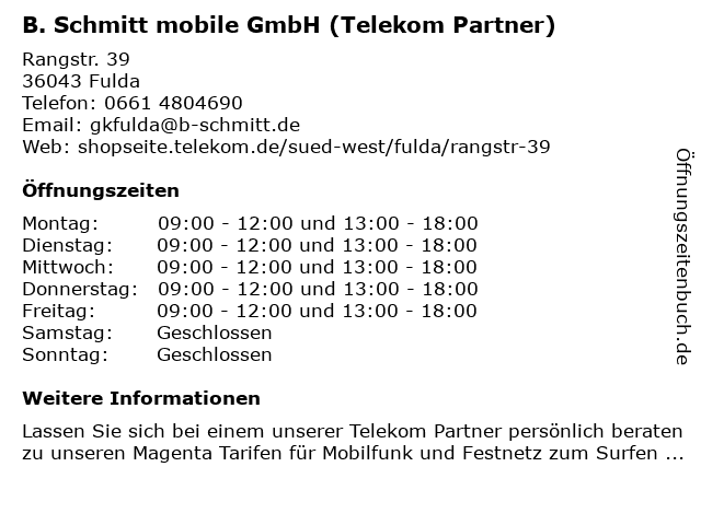 Öffnungszeiten B. Schmitt mobile GmbH (Telekom Partner)