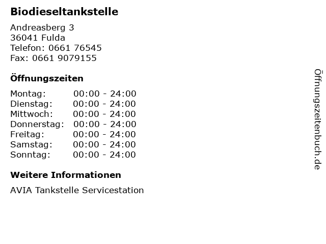| Öffnungszeiten Biodieseltankstelle in Fulda anzeigen | |