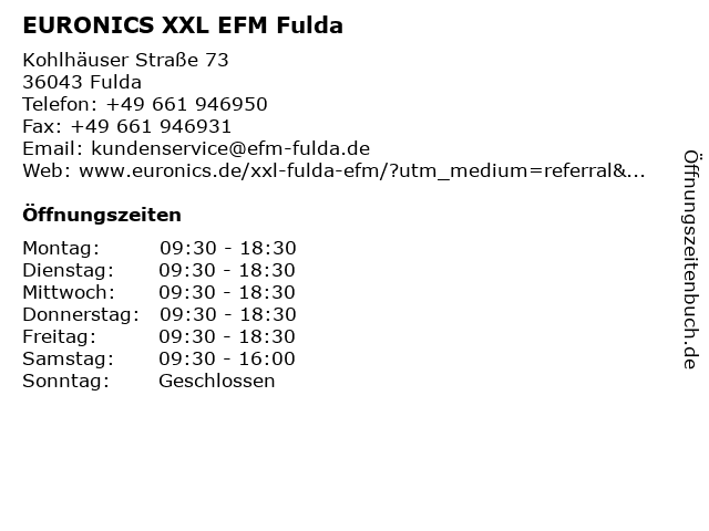 | Öffnungszeiten EURONICS XXL EFM Fulda in Fulda anzeigen | |