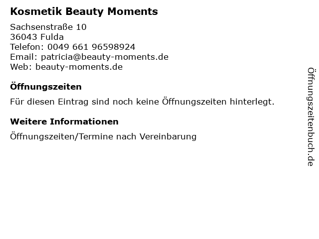 | Öffnungszeiten Kosmetik Beauty Moments in Fulda anzeigen | |