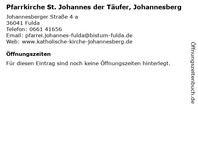 1 Pfarrei St. Johannes d. Täufer Johannesberg - geschlossen (Entfernung: 0,00 km) Johannesberger Straße 4, 36041 Fulda 2 Kontaktstelle St. Johannes d. Täufer, Fulda-Johannesberg - Geschlossen (Entfernung: 0,00 km) Johannesberger Straße 4, 36041 Fulda 3 Raiffeisenbank im Fuldaer Land eG - SB- und Beratungscenter Johannesberg (Entfernung: 0,08 km) Am Kies 2A, 36041 Fulda 6 |