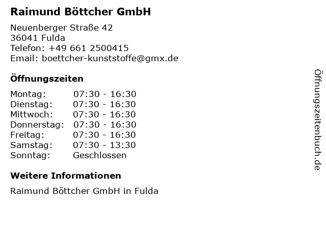 | Öffnungszeiten Raimund Böttcher GmbH in Fulda anzeigen | |