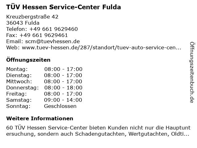 3 TÜV Hessen - MPU Begutachtungsstelle Fahreignung Fulda (Entfernung: 1,95 km) Bahnhofstraße 26, 36037 Fulda 6 |