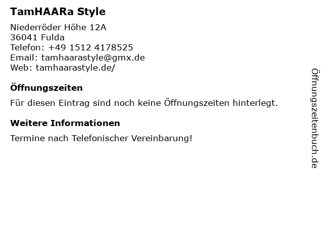 | Öffnungszeiten TamHAARa Style in Fulda anzeigen | |