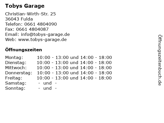 | Öffnungszeiten Tobys Garage in Fulda anzeigen | |