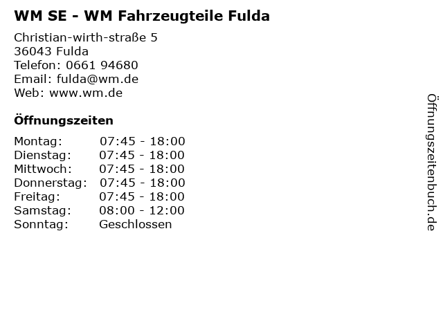 | Öffnungszeiten WM SE - WM Fahrzeugteile Fulda in Fulda anzeigen | |