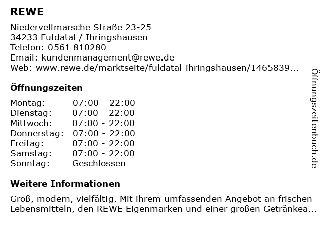 | Öffnungszeiten REWE in Fuldatal / Ihringshausen anzeigen | |