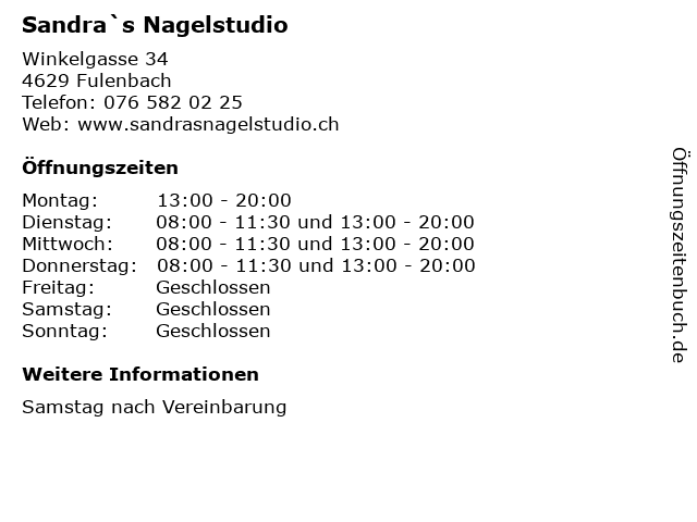 | Öffnungszeiten Sandra`s Nagelstudio in Fulenbach anzeigen | |