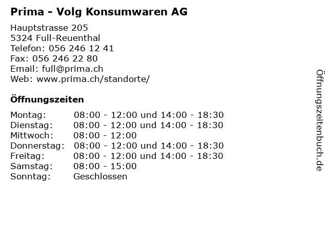 Prima - Volg Konsumwaren AG in Full-Reuenthal: Telefonnummer, Öffnungszeiten und Adresse
