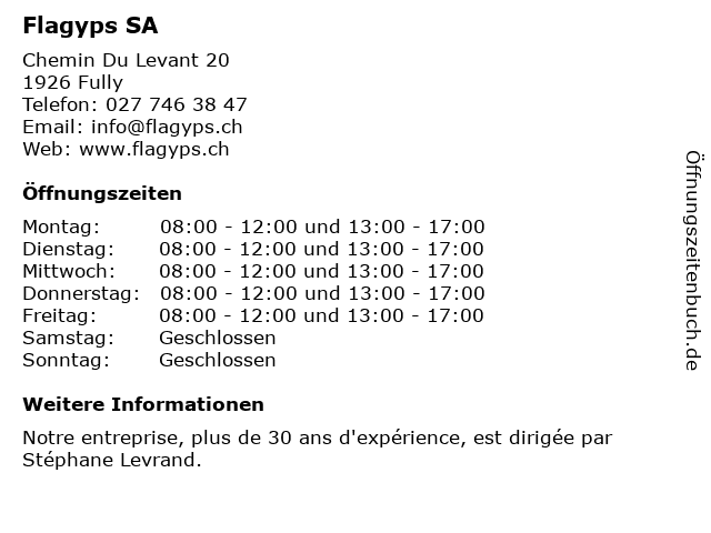 | Öffnungszeiten Flagyps SA in Fully anzeigen | |