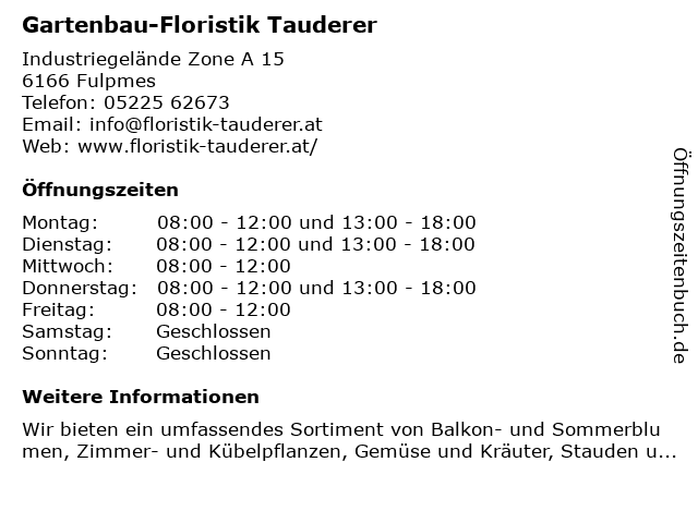 | Öffnungszeiten Gartenbau-Floristik Tauderer in Fulpmes anzeigen | |