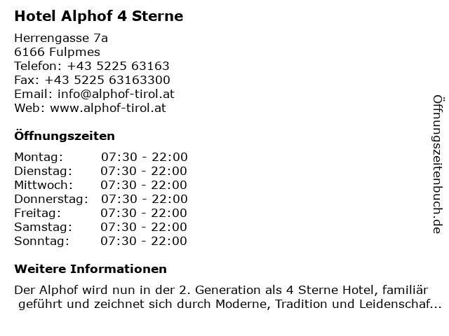 | Öffnungszeiten Hotel Alphof 4 Sterne in Fulpmes anzeigen | |