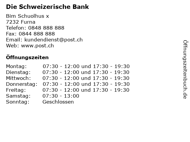 | Öffnungszeiten Die Schweizerische Bank in Furna anzeigen | |