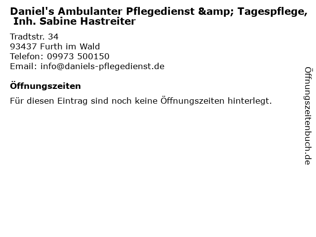 Branchen & Suchbegriffe zu Daniel's Ambulanter Pflegedienst & Tagespflege, Inh. Sabine Hastreiter:ambulanter, daniel's, hastreiter, pflegedienst, sabine, tagespflege |