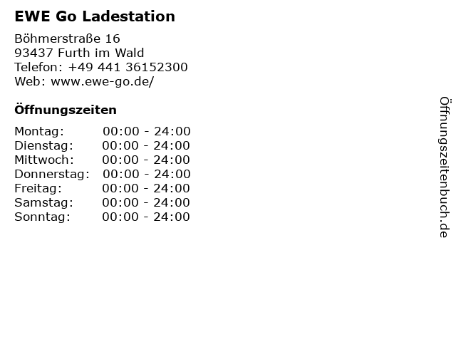 | Öffnungszeiten EWE Go Ladestation in Furth im Wald anzeigen | |