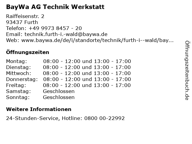 | Öffnungszeiten BayWa AG Technik Werkstatt in Furth anzeigen | |