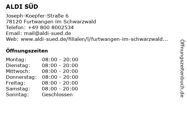 | Öffnungszeiten ALDI SÜD in Furtwangen im Schwarzwald anzeigen | |