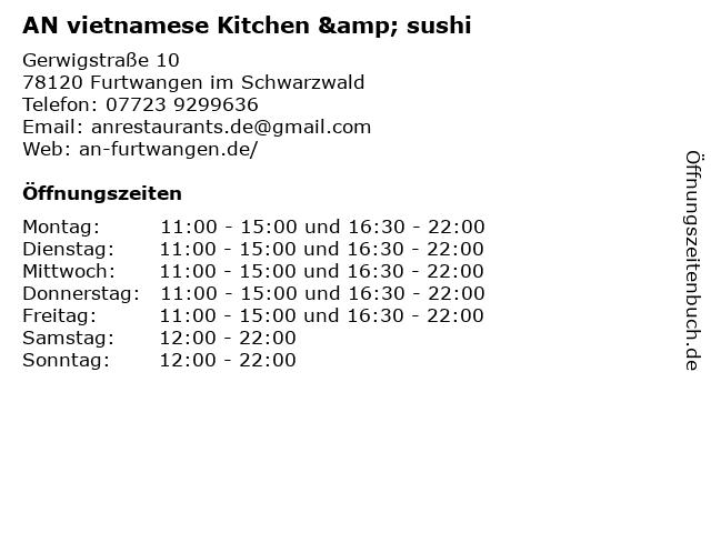 Branchen & Suchbegriffe zu AN vietnamese Kitchen & sushi:an, bistro, essen, gastronomie, getränke, hauptgerichte, kitchen, küche, restaurant, salat, sushi, vietnamese, vorspeisen |