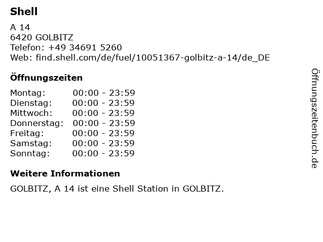 | Öffnungszeiten Shell in GOLBITZ anzeigen | |