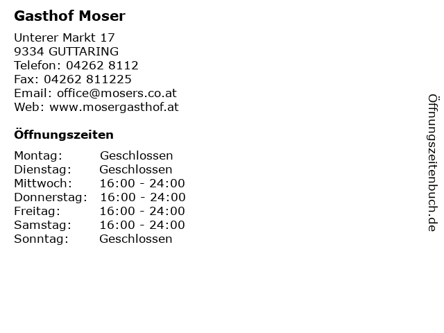 | Öffnungszeiten Gasthof Moser in GUTTARING anzeigen | |