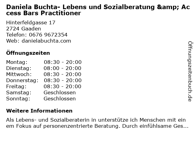 Branchen & Suchbegriffe zu Daniela Buchta- Lebens und Sozialberatung & Access Bars Practitioner:access, bars, buchta, daniela, lebens, lebenscoaching, practitioner, sozialberatung |