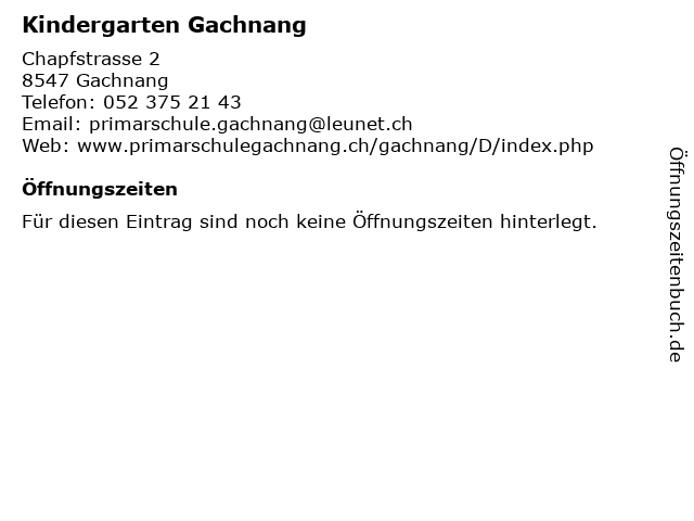 | Öffnungszeiten Kindergarten Gachnang in Gachnang anzeigen | |