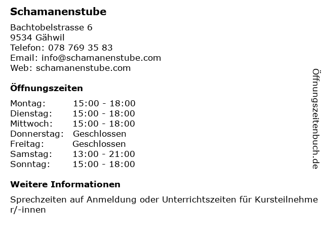 | Öffnungszeiten Schamanenstube in Gähwil anzeigen | |